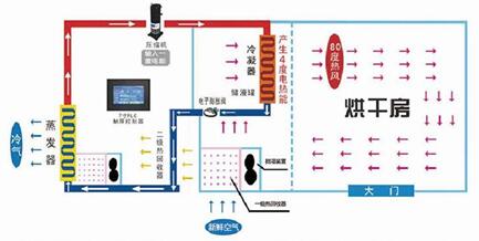 工作原理:利用逆卡諾原理,氣體氟利昂被壓縮機加壓,成為高溫高壓氣體(溫度高達100℃),進入室內側的換熱器(冷凝器),冷媒冷凝液化釋放出高溫熱量加熱烘干房內空氣。